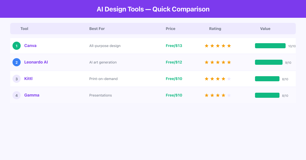 Each of these tools excels in a different design context. Leonardo AI is the top pick for generating original creative imagery with fine-grained control. Canva is the best all-around platform that handles virtually any design task with an unmatched template library and well-integrated AI features. Kittl is the clear choice for print-on-demand sellers and anyone focused on typography-heavy merchandise design. Gamma is the future of presentations, turning a text prompt into polished, interactive decks.