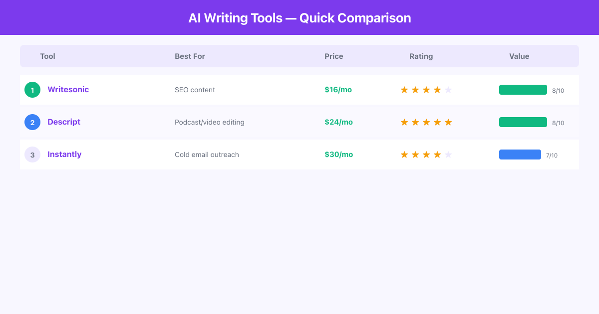 These three tools cover the most important AI writing use cases, with zero overlap between them. Writesonic is the clear leader for SEO content and marketing copy, producing well-structured articles that rank and convert. Descript is in a category of its own for anyone who creates spoken content, with its text-based media editing fundamentally changing how scripts are written and refined. Instantly owns the cold email space, with AI-powered outreach copy that consistently outperforms manually written alternatives.