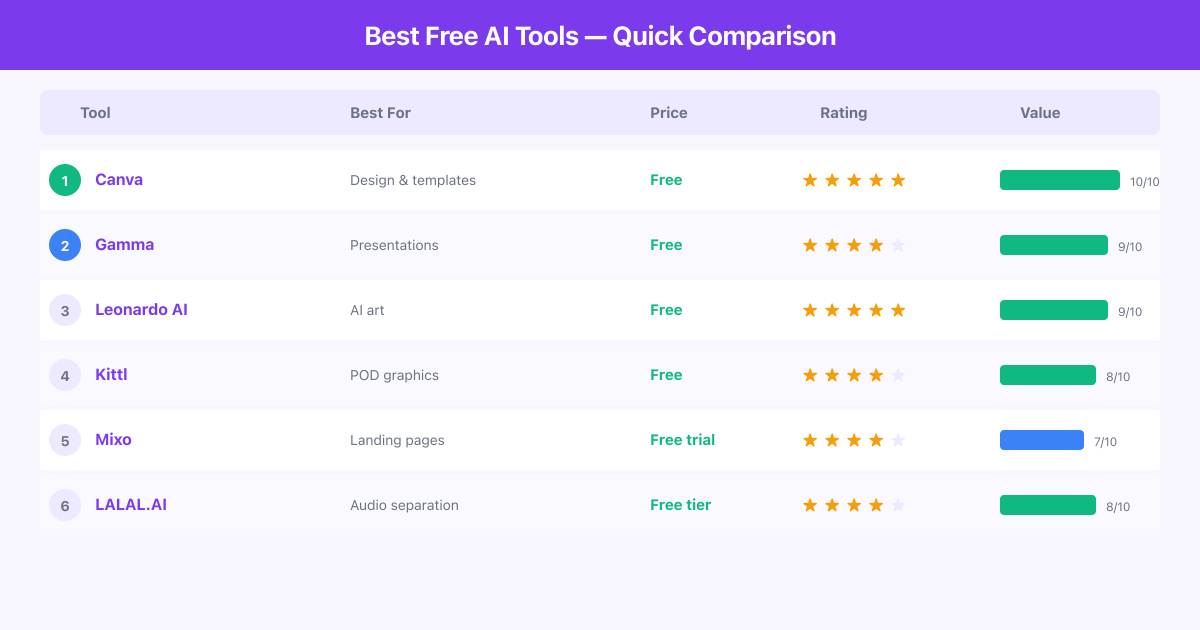 You do not need to spend money to start using powerful AI tools. Canva offers the most versatile free creative suite, Gamma is the best free option for AI-generated presentations, and Leonardo AI leads for free AI image generation. Kittl handles design with a focus on print-on-demand, Mixo lets you build landing pages instantly, and LALAL.AI separates vocal and instrumental tracks with impressive accuracy. All six tools let you get started without entering a credit card.
