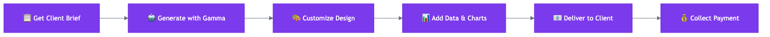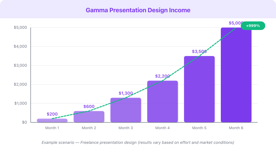 The economics of this business model are exceptionally favorable. With Gamma, you can create a polished, professional presentation in 5–10 minutes that would take a traditional designer 2–4 hours. But the client still values the output at $50–500 depending on complexity. That gap between your production cost (minutes of time) and the customer's perceived value (hours of designer work saved) is your profit margin — and it is substantial.