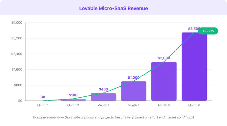 Example Scenario: Niche Booking Tool. A yoga instructor builds a class booking and payment system using Lovable. Development time: one weekend. She launches in local yoga Facebook groups and signs up 15 studios in her city at $19/month within the first two months. Monthly revenue: $285. By month 6, word-of-mouth and a simple Google Ads campaign bring total customers to 60. Monthly revenue: $1,140.