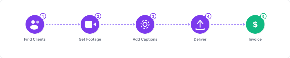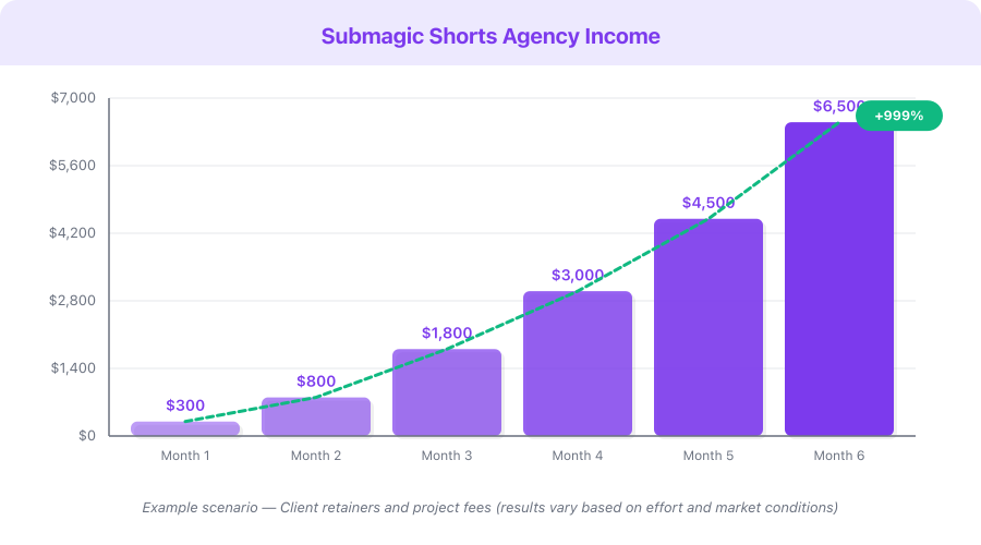 The highest-margin opportunity. Charge clients $500-2,000/month for monthly clip packages. With Submagic handling production, your per-clip cost (time + tool) is under $2. Even the cheapest package ($500/month for 8 clips) generates $462 in profit after Submagic's $19 fee and roughly $19 worth of your time. Scale to 10+ clients for five-figure monthly revenue.